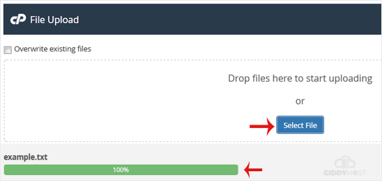 5. Click on Select File and choose the file you want to upload from your computer. Click open and the upload process will begin. You can also drag and drop files from your computer in the upload box.