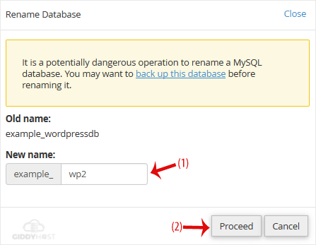 3. Under Current Databases, you can see a list of all your databases. Locate the Database and then click on Rename.