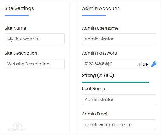 • Admin Username: Your new Xoops username (for security reasons, do not use the administrator or the admin username).