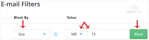 If you have chosen size in MB and have entered the value 5, all emails exceeding 5MB in size will be blocked.